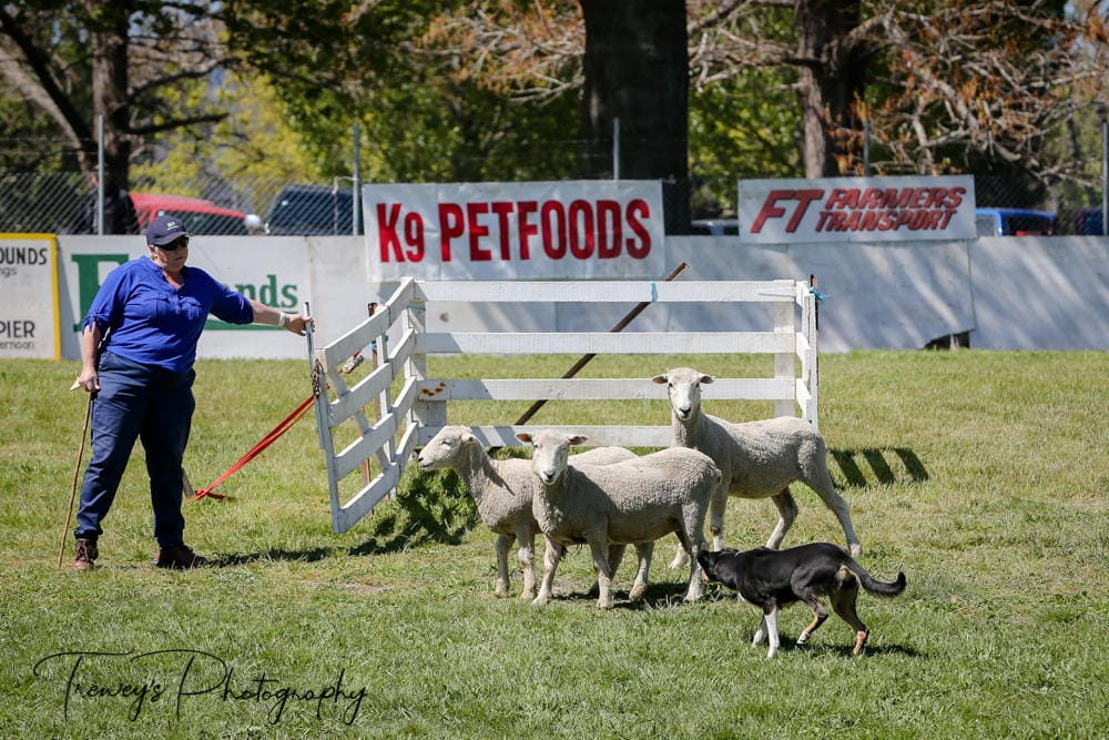 Hawkes Bay A&P Show sheep dog working 3 sheep into a pen